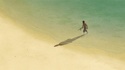 Мужчина попадает на необитаемый остров. Ему удаётся построить плот, но далеко уплыть не получается - красная черепаха пресекает все его попытки к бегству.
