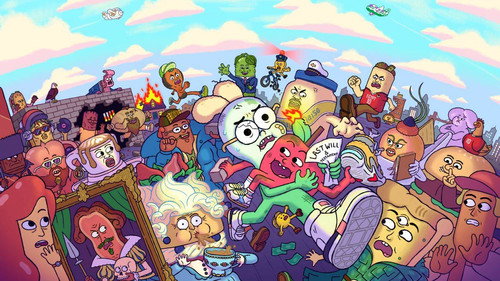 cartoon, food, big city, apple, anthropomorphic fruit, onion, anthropomorphic food