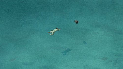 Мужчина попадает на необитаемый остров. Ему удаётся построить плот, но далеко уплыть не получается - красная черепаха пресекает все его попытки к бегству.